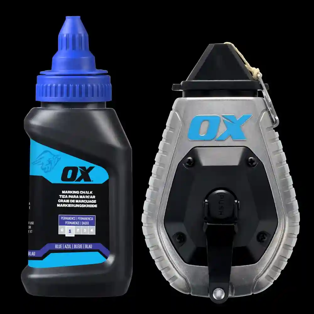 the OX Pro Series Aluminium Chalk Reel features a robust aluminium body for maximum durability. But what truly sets this chalk reel apart is its revolutionary 30m/100’ Kevlar® bold line—a game-changer in the world of chalk reels. Integrated hook storage and a pin & hook design allow for quick snaps, while the 6:1 planetary gears ensure rapid reeling. The clutch release feature makes reeling effortless, making this chalk reel an essential tool for professionals who demand reliability and performance on the job.